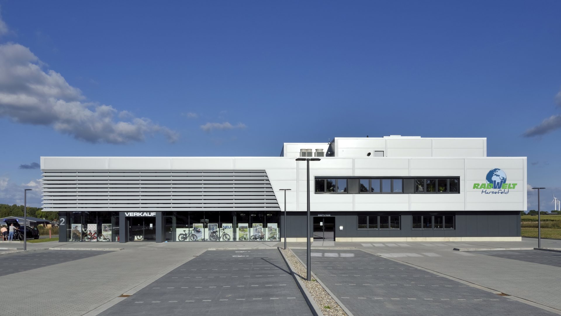 Wall facade with 2 different colors and types of laying (horizontal/vertical). Elaborate Precision work through many facade transitions, e.g. Color transitions in bevel cut and transitions from the wall facade to the sun protection slats.